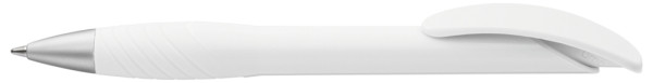 Druckkugelschreiber mit gedeckt glänzendem Gehäuse, Bogenclipdrücker, ergonomische Gummigriffzone und Metallspitze matt verchromt.