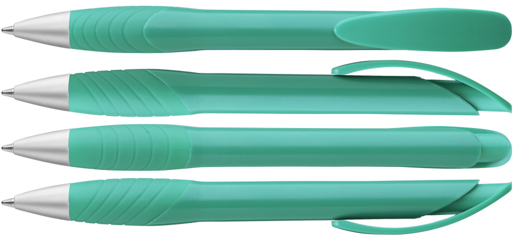 Druckkugelschreiber mit gedeckt glänzendem Gehäuse, Bogenclipdrücker, ergonomische Gummigriffzone und Metallspitze matt verchromt.