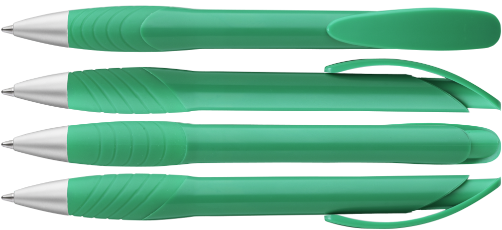 Druckkugelschreiber mit gedeckt glänzendem Gehäuse, Bogenclipdrücker, ergonomische Gummigriffzone und Metallspitze matt verchromt.