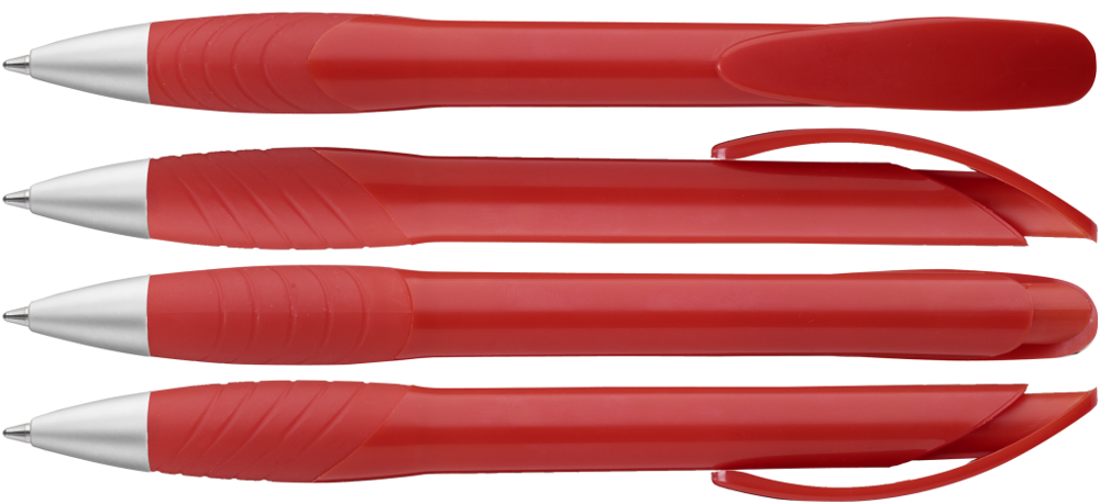 Druckkugelschreiber mit gedeckt glänzendem Gehäuse, Bogenclipdrücker, ergonomische Gummigriffzone und Metallspitze matt verchromt.
