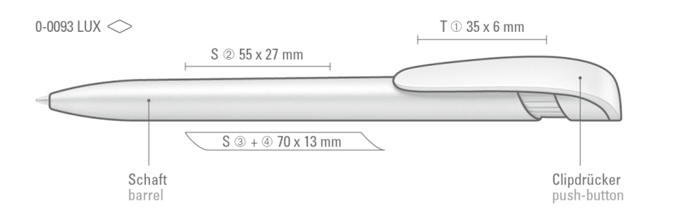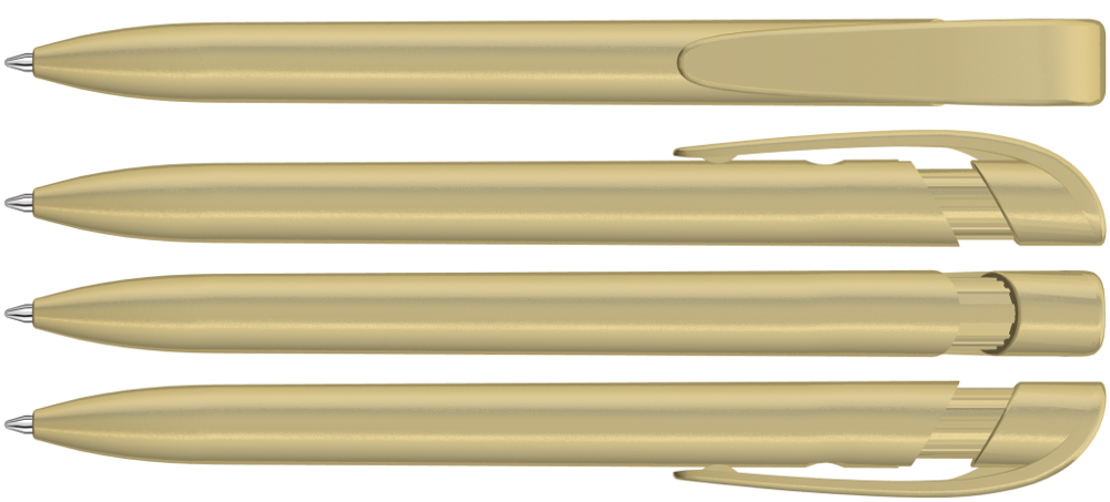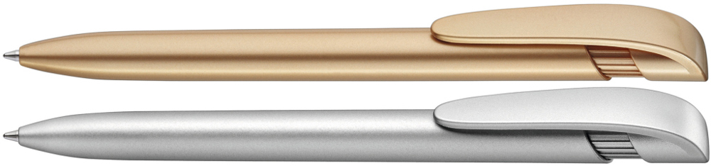Druckkugelschreiber mit gedeckt glänzendem Gehäuse in silber oder gold und breitem Bogenclipdrücker. mehr