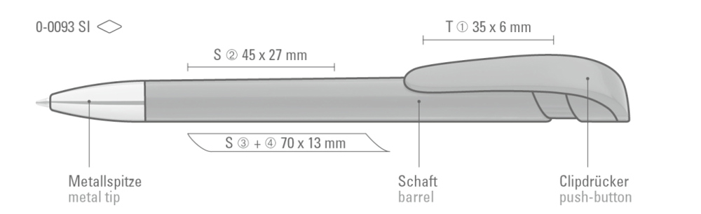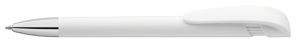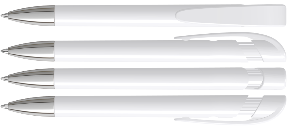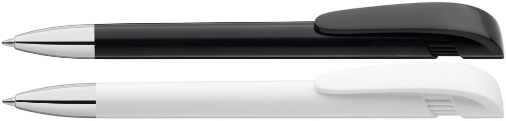 Druckkugelschreiber mit gedeckt glänzendem Gehäuse in schwarz oder weiß, breitem Bogenclipdrücker und schwerer Metallspitze glanzverchromt.