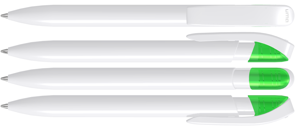 Druckkugelschreiber mit gedeckt glänzendem Gehäuse in uni weiß oder schwarz und farbig transparent glänzende Manschette.