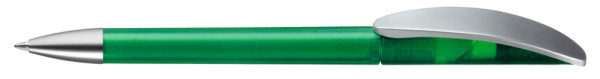 Drehkugelschreiber mit transparent gefrostetem oder gedeckt mattem Gehäuse, Bogenclip silber matt und schwerer Metallspitze matt verchromt.