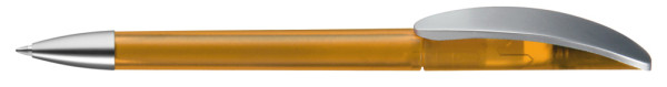 Drehkugelschreiber mit transparent gefrostetem oder gedeckt mattem Gehäuse, Bogenclip silber matt und schwerer Metallspitze matt verchromt.