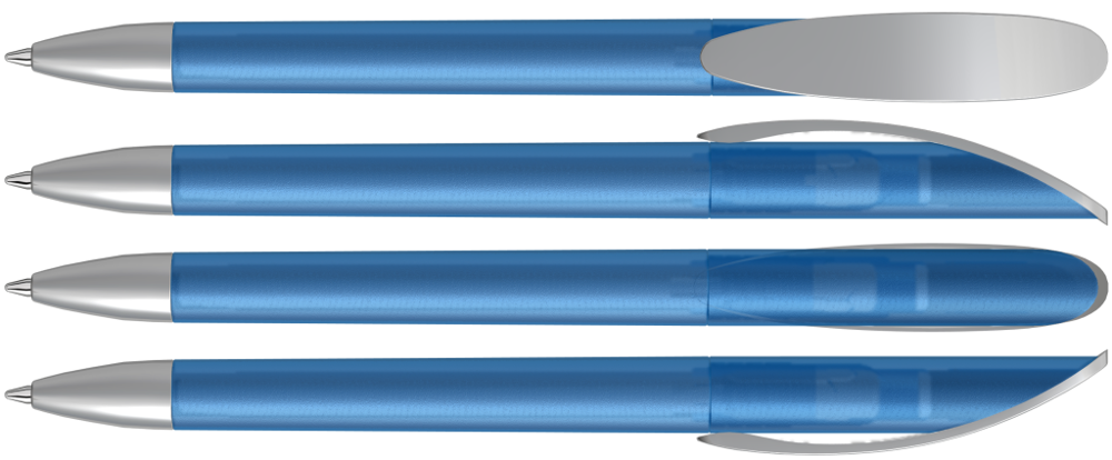 Drehkugelschreiber mit transparent gefrostetem oder gedeckt mattem Gehäuse, Bogenclip silber matt und schwerer Metallspitze matt verchromt.