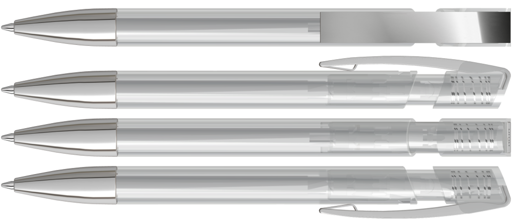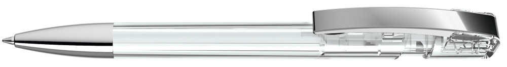 Druckkugelschreiber mit transparent glänzendem Gehäuse, flexiblem Metallclip und schwerer Metallspitze glanzverchromt.