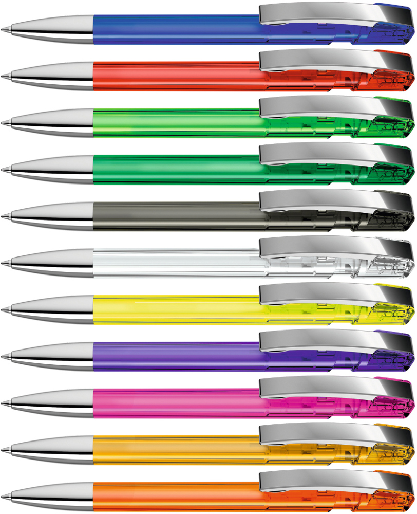 Druckkugelschreiber mit transparent glänzendem Gehäuse, flexiblem Metallclip und schwerer... mehr