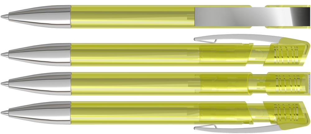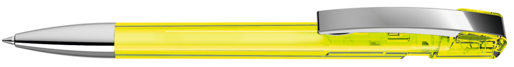 Druckkugelschreiber mit transparent glänzendem Gehäuse, flexiblem Metallclip und schwerer Metallspitze glanzverchromt.