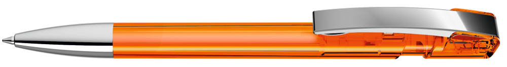 Druckkugelschreiber mit transparent glänzendem Gehäuse, flexiblem Metallclip und schwerer Metallspitze glanzverchromt.