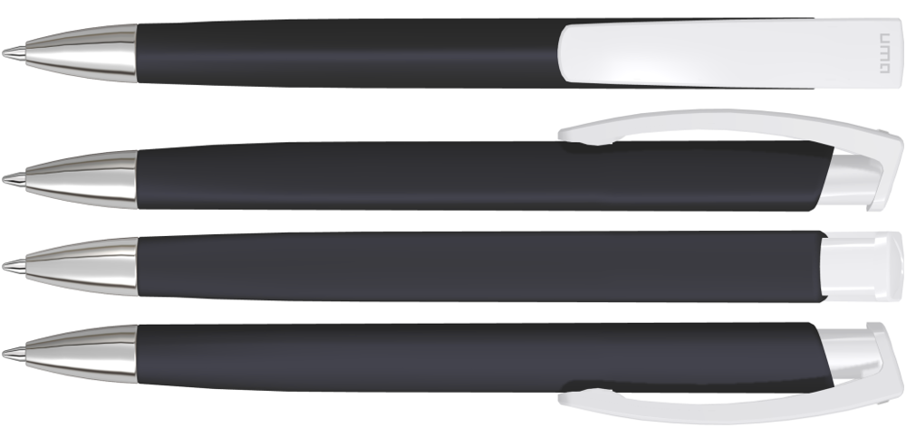 Druckkugelschreiber mit gummiertem Dreikantgehäuse, weiß gedeckt glänzendem Clip und schwerer Metallspitze glanzverchromt.