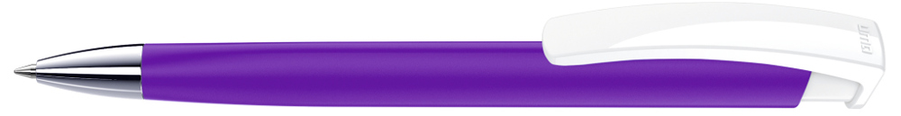 Druckkugelschreiber mit gummiertem Dreikantgehäuse, weiß gedeckt glänzendem Clip und schwerer Metallspitze glanzverchromt.