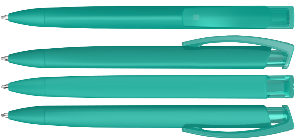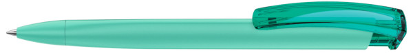 Druckkugelschreiber mit gummiertem Dreikantgehäuse und transparent glänzendem Clip.