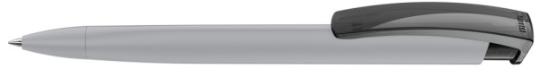 Druckkugelschreiber mit gummiertem Dreikantgehäuse und transparent glänzendem Clip.
