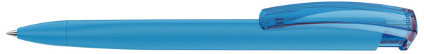 Druckkugelschreiber mit gummiertem Dreikantgehäuse und transparent glänzendem Clip. mehr