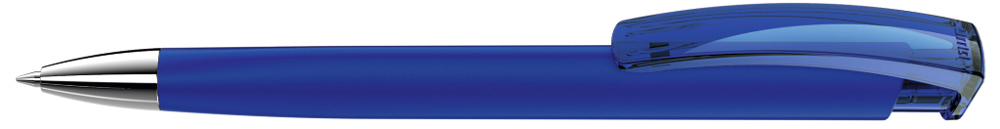 Druckkugelschreiber mit gummiertem Dreikantgehäuse, transparent glänzendem Clip und schwerer Metallspitze glanzverchromt.