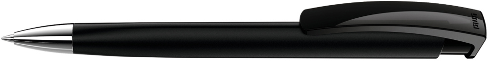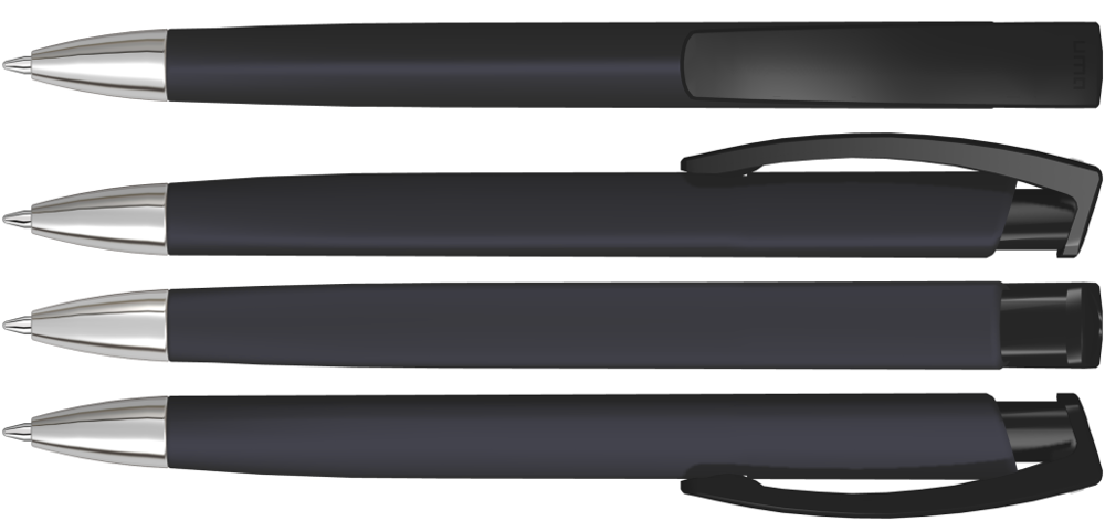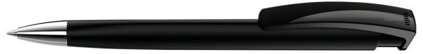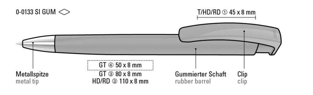 Druckkugelschreiber mit gummiertem Dreikantgehäuse, gedeckt glänzendem Clip und schwerer Metallspitze glanzverchromt.
