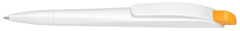 Druckkugelschreiber mit geometrisch wechselnder Schaftform. Gehäuse gedeckt matt schwarz oder weiß mit Bogenclip und farbigem Drücker.