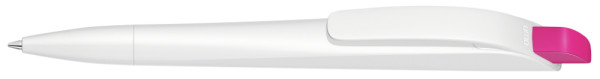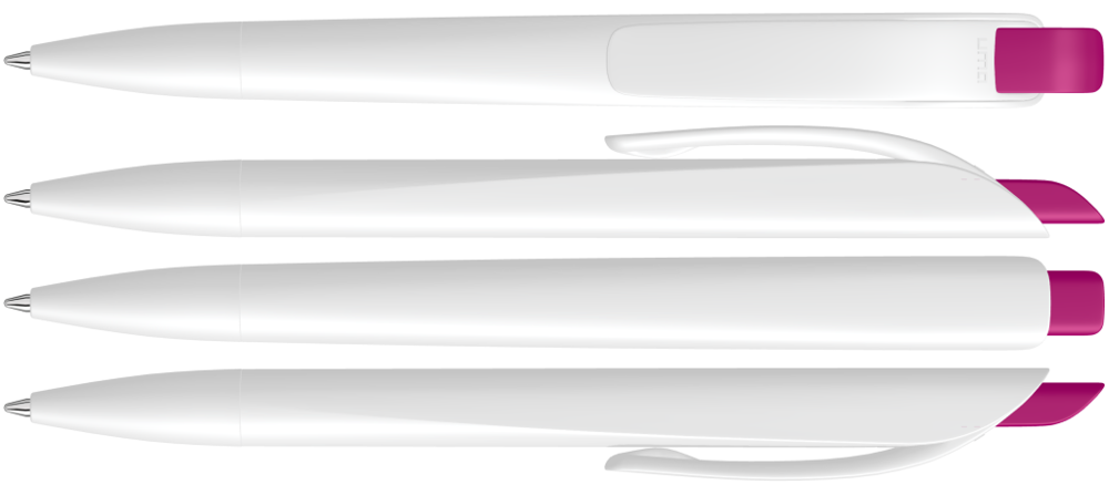Druckkugelschreiber mit geometrisch wechselnder Schaftform. Gehäuse gedeckt matt schwarz oder weiß mit Bogenclip und farbigem Drücker.