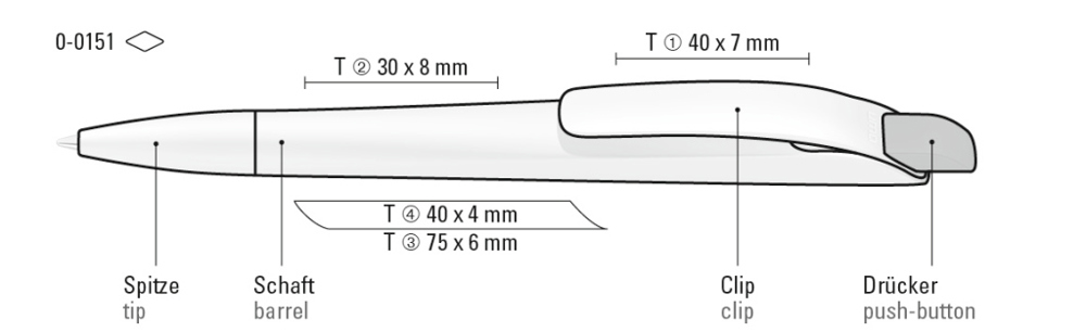Druckkugelschreiber mit geometrisch wechselnder Schaftform. Gehäuse gedeckt matt schwarz oder weiß mit Bogenclip und farbigem Drücker.