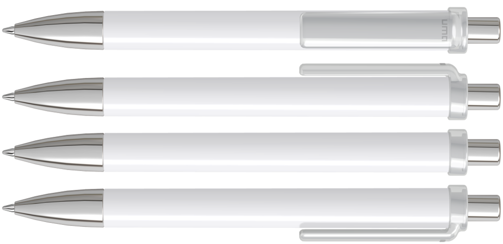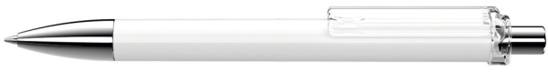Druckkugelschreiber mit gedeckt glänzendem Schaft, transparent glänzendem Clip, Metallspitze und Metalldrücker glanzverchromt.