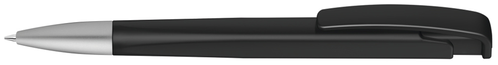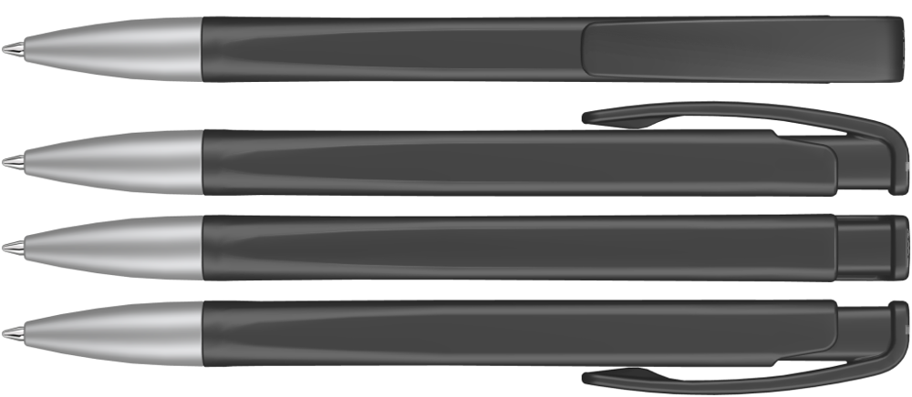 Druckkugelschreiber mit geometrisch wechselnder Schaftform, matt gedecktem Gehäuse und Metallspitze matt verchromt.