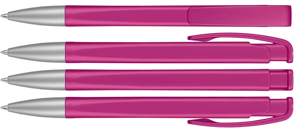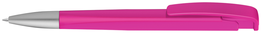 Druckkugelschreiber mit geometrisch wechselnder Schaftform, matt gedecktem Gehäuse und Metallspitze matt verchromt.