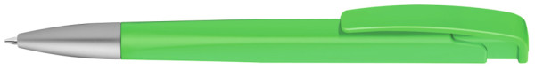 Druckkugelschreiber mit geometrisch wechselnder Schaftform, matt gedecktem Gehäuse und Metallspitze matt verchromt.