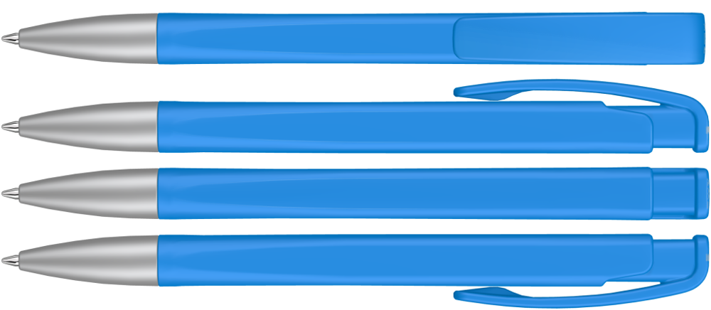 Druckkugelschreiber mit geometrisch wechselnder Schaftform, matt gedecktem Gehäuse und Metallspitze matt verchromt.