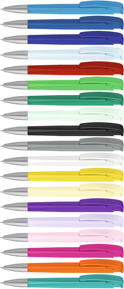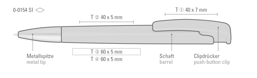 Druckkugelschreiber mit geometrisch wechselnder Schaftform, matt gedecktem Gehäuse und Metallspitze matt verchromt.