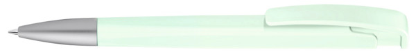 Druckkugelschreiber mit geometrisch wechselnder Schaftform, matt gedecktem Gehäuse und Metallspitze matt verchromt.