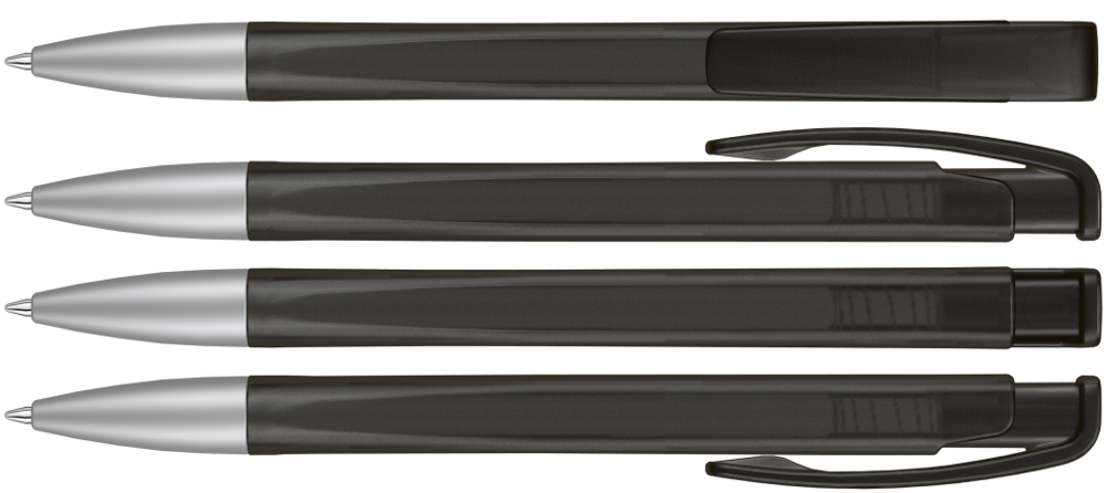 Druckkugelschreiber mit geometrisch wechselnder Schaftform, transparent gefrostetem Gehäuse und Metallspitze matt verchromt.