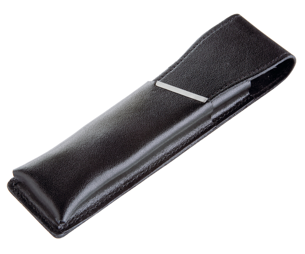 Schwarzes Lederetui für ein oder zwei Schreibgeräte mit silberfarbener Metallleiste.