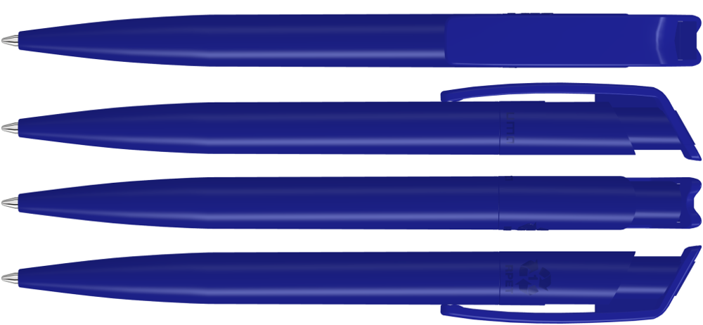 Druckkugelschreiber aus recyceltem PET-Material mit gedeckt glänzendem Gehäuse und Stopfen.