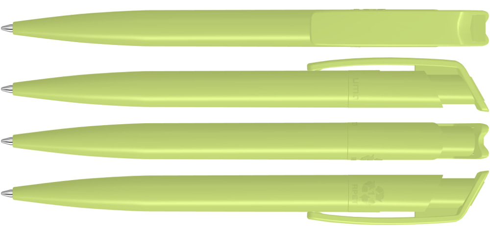 Druckkugelschreiber aus recyceltem PET-Material mit gedeckt glänzendem Gehäuse und Stopfen.
