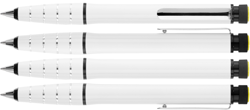 Metall-Drehkugelschreiber aus Aluminium mit integriertem gelb schreibenden Textmarker im Schaft. Der Textmarker lässt sich mittels Drehbewegung aus dem Schaft herausnehmen und kann separat genutzt werden.