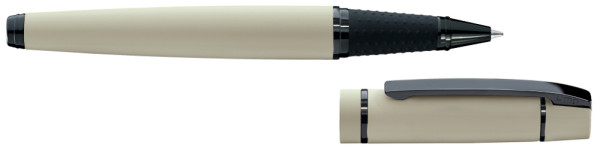Metall-Rollerball mit Softtouch-Gehäuse, gefedertem Clip und schwarzer Gummigriffzone. Beschlagteile schwarz glänzend lackiert.