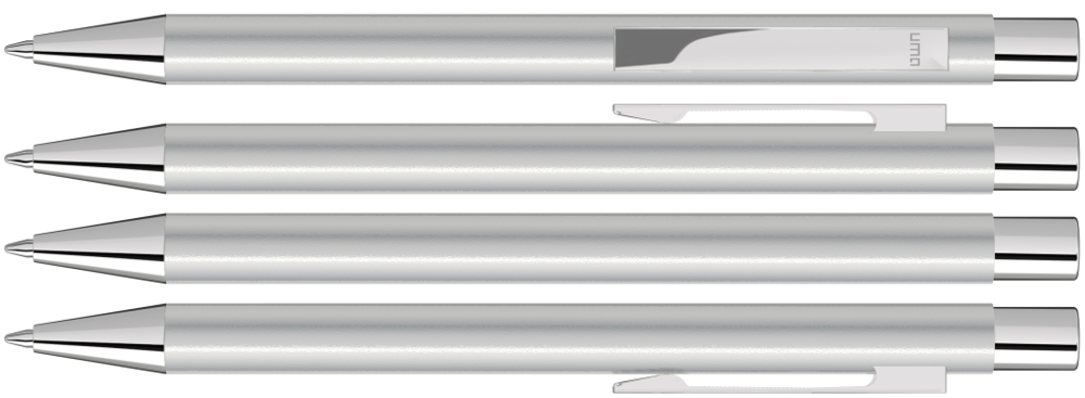 Metall-Druckkugelschreiber mit mattem Gehäuse. Metallclip, Metallspitze und Drücker silber glänzend.