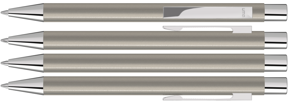 Metall-Druckkugelschreiber mit mattem Gehäuse. Metallclip, Metallspitze und Drücker silber glänzend.