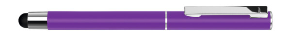 Metall-Rollerball mit mattem Gehäuse. Metallclip und Zierring silber glänzend, Griffzone schwarz. Gummiertes Schaftende für die Touchscreensteuerung.