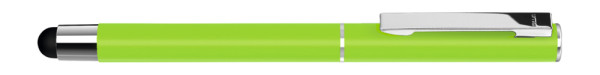 Metall-Rollerball mit mattem Gehäuse. Metallclip und Zierring silber glänzend, Griffzone schwarz. Gummiertes Schaftende für die Touchscreensteuerung.