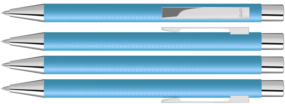 Metall-Druckbleistift (0,7mm) mit mattem Gehäuse. Metallclip, Metallspitze und Drücker silber glänzend. Radiergummi im Drücker.