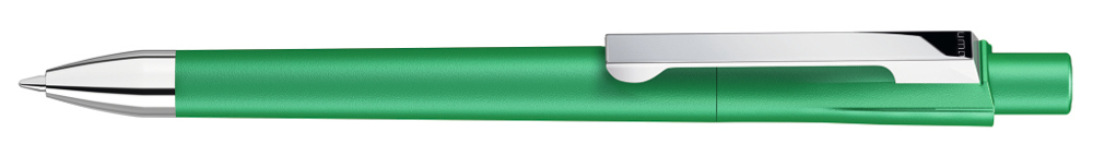 Druckkugelschreiber mit gedeckt mattem Gehäuse. Schwere Metallspitze und Metallclip glanzverchromt.