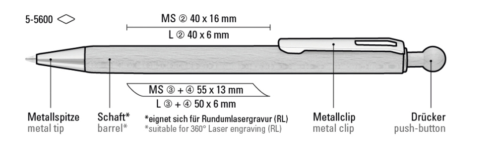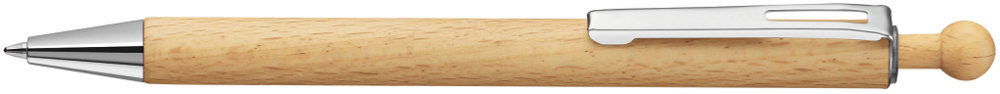 Holz-Druckkugelschreiber mit Holz-Kugeldrücker, Metallclip und Metallspitze silber glänzend. Schaft und Drücker aus schutzlackiertem PEFC-zertifiziertem Buchenholz.