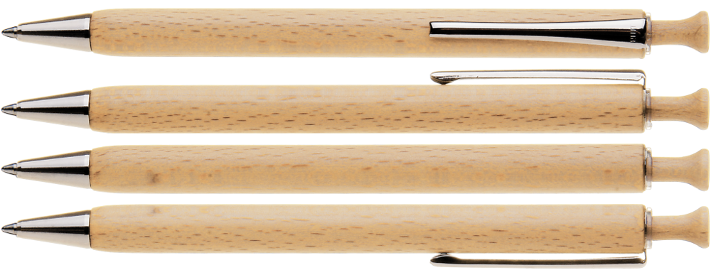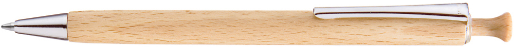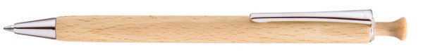 Holz-Druckkugelschreiber mit Holzdrücker, Metallclip und Metallspitze silber glänzend. Schaft und Drücker aus schutzlackiertem PEFC-zertifiziertem Buchenholz.