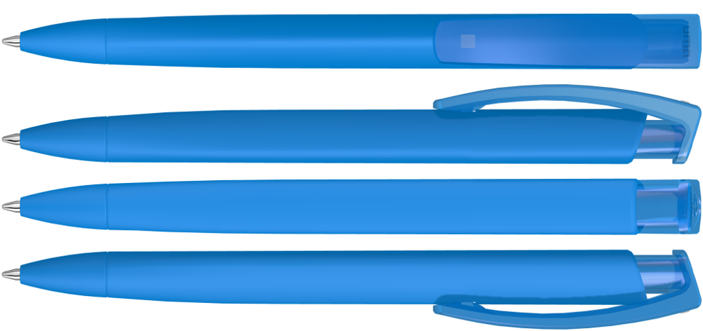 Druckkugelschreiber mit gedeckt mattem Dreikantgehäuse und transparent glänzendem Clip aus recyceltem ABS Kunststoff. Das Modell ist mit dem Recyclingzeichen gekennzeichnet.