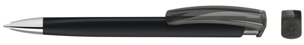 Druckkugelschreiber mit gedeckt mattem Dreikantgehäuse, transparent glänzendem Clip aus recyceltem ABS Kunststoff und schwerer Metallspitze glanzverchromt. Das Modell ist mit dem Recyclingzeichen gekennzeichnet.
