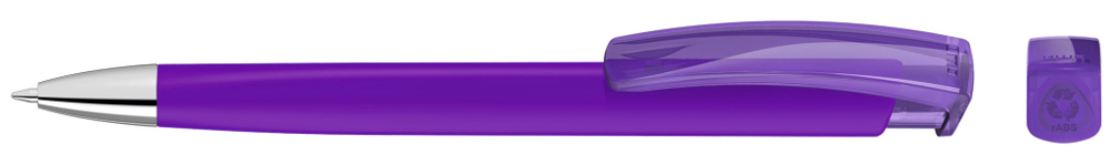 Druckkugelschreiber mit gedeckt mattem Dreikantgehäuse, transparent glänzendem Clip aus recyceltem ABS Kunststoff und schwerer Metallspitze glanzverchromt. Das Modell ist mit dem Recyclingzeichen gekennzeichnet.