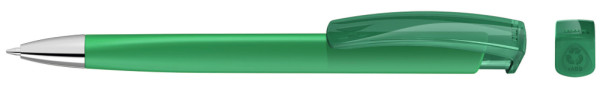 Druckkugelschreiber mit gedeckt mattem Dreikantgehäuse, transparent glänzendem Clip aus recyceltem ABS Kunststoff und schwerer Metallspitze glanzverchromt. Das Modell ist mit dem Recyclingzeichen gekennzeichnet.