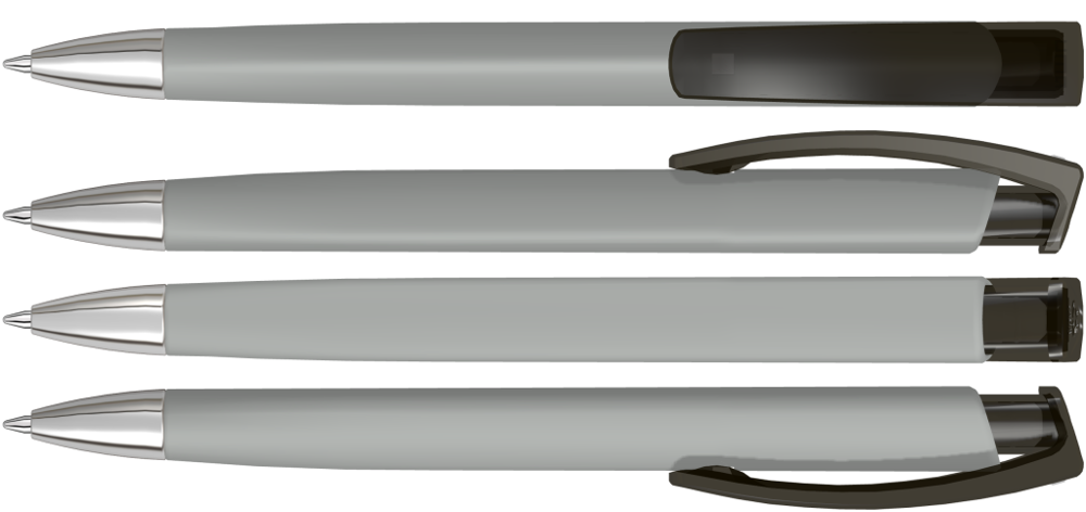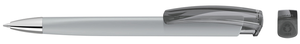 Druckkugelschreiber mit gedeckt mattem Dreikantgehäuse, transparent glänzendem Clip aus recyceltem ABS Kunststoff und schwerer Metallspitze glanzverchromt. Das Modell ist mit dem Recyclingzeichen gekennzeichnet.
